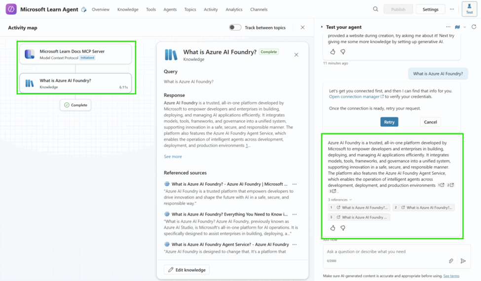 Let’s ask a simple prompt, “What is Azure AI Foundry?“. On first running of the prompt, we get the message “Let’s get you connected first, and then I can find that info for you. ​Open connection manager​ to verify your credentials”: