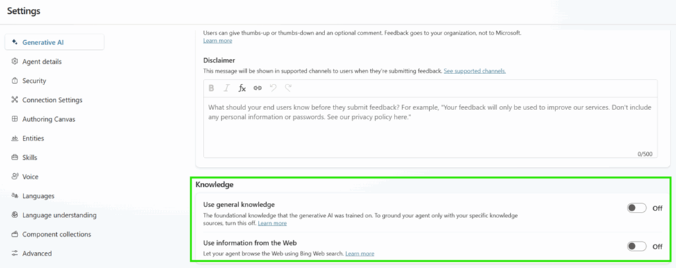 Note, even though our prompt returns results from Microsoft Learn, it is still actually returning data from other sources. To turn this off, go to Settings->Generative AI, then under Knowledge turn off “Use general knowledge” and “Use information from the Web”: