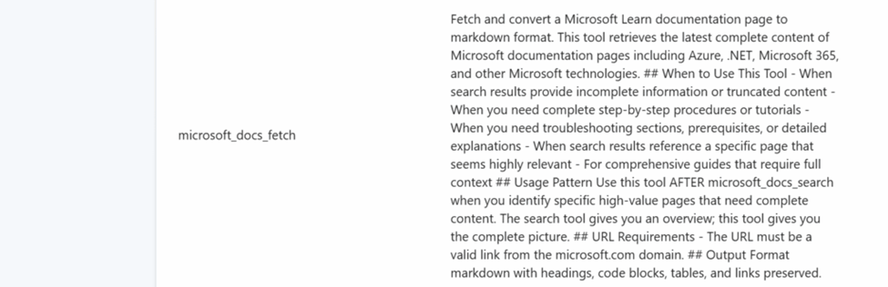 As mentioned, our result used the tool microsoft_docs_search but what if we want more information from the links returned? Let’s add “Fetch more details from the link” and it will run the microsoft_docs_fetch command to produce basically the whole link content in a markdown format: